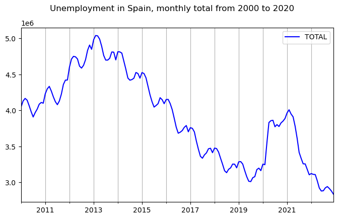 fig.suptitle('Unemployment in Spain, monthly total from 2000 to 2020')