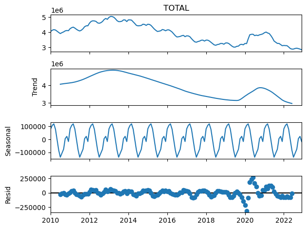 fdata_dcmp_add = seasonal_decompose(fdata['TOTAL'], model='additive')And now we can look at the different components of the decomposition. Beginning with the trend component: