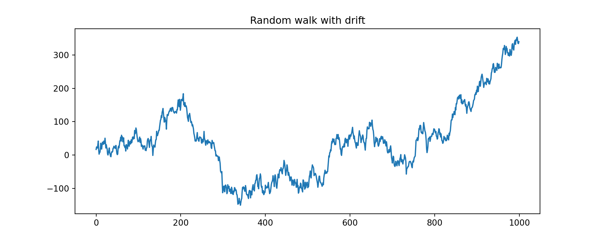A random walk is an stochastic process usually defined by: \[y_t = k + y_{t-1} + w_t\]