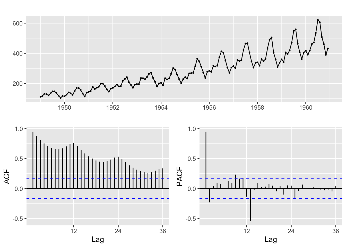 ggtsdisplay(AirPassengers)