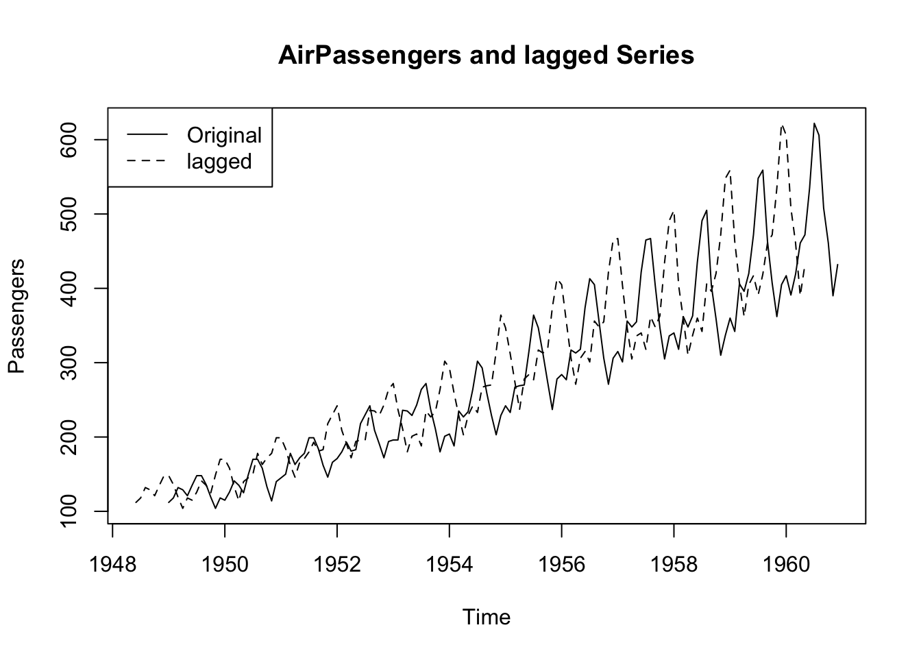 AirPassengers_lag <- cbind(Original = AirPassengers, lagged = lagged)