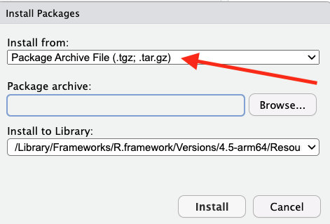 Then in RStudio use the Packages tab in the bottom right panel, click the Install button and then, in the window that opens, make sure to select Package Archive File as indicated below: