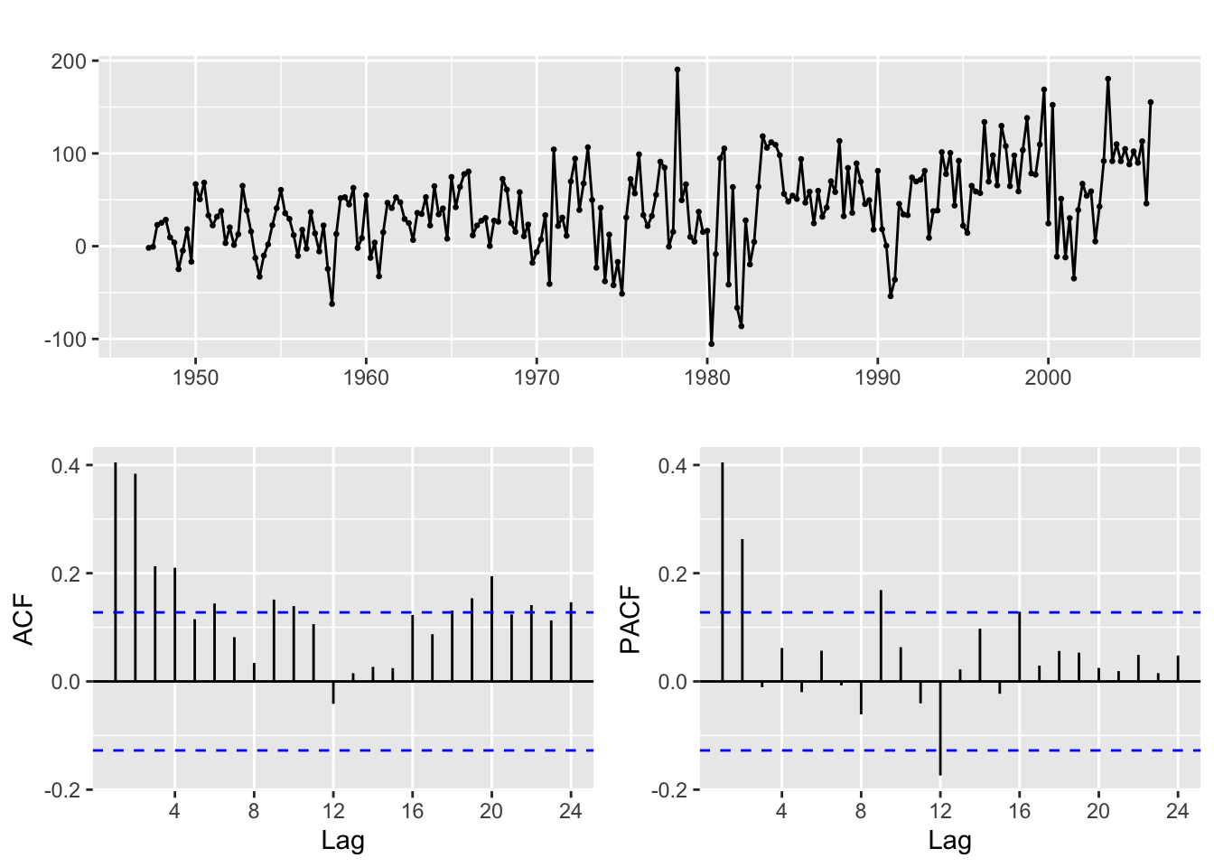\[ \nabla y_t = y_t - y_{t-1} = b + \nabla u_t \] Now, if \(u_t\) is (weakly) stationary, the same holds for its first order difference. Keep in mind, however, that differencing adds extra dynamics to the time series! For example, if \(u_t\) above is white noise, then its difference will be stationary but it will no longer be white noise: it will be –by definition– an MA(1) process.