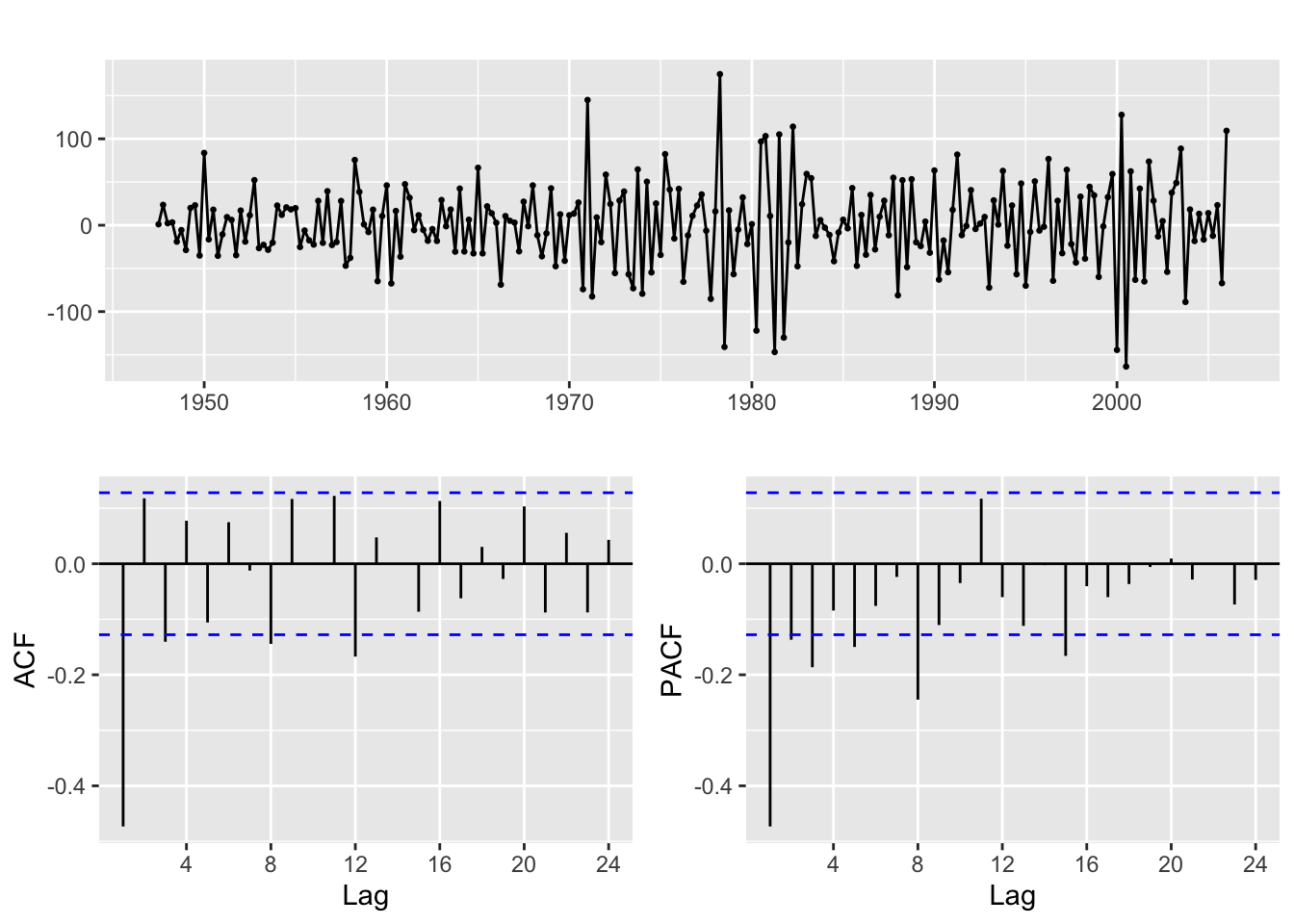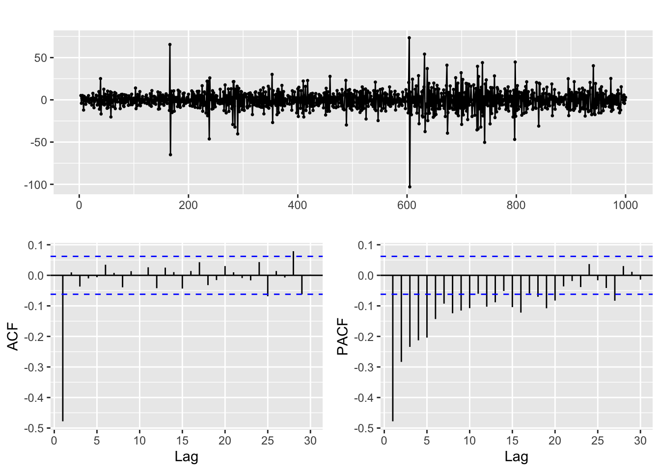 But when we overdifference it a new dynamic appears in the resulting series, as shown in the ACF and PACF below. Fitting a model to this second order difference is a bad idea, as it will make the forecasts and estimates unreliable.