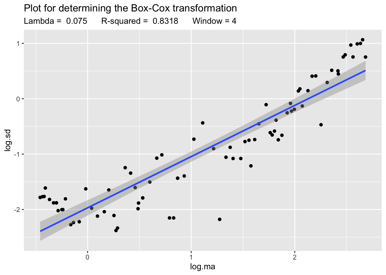 The plot and the high value of \(R^2\) indicate that Box-Cox can be in fact useful. So we apply it: