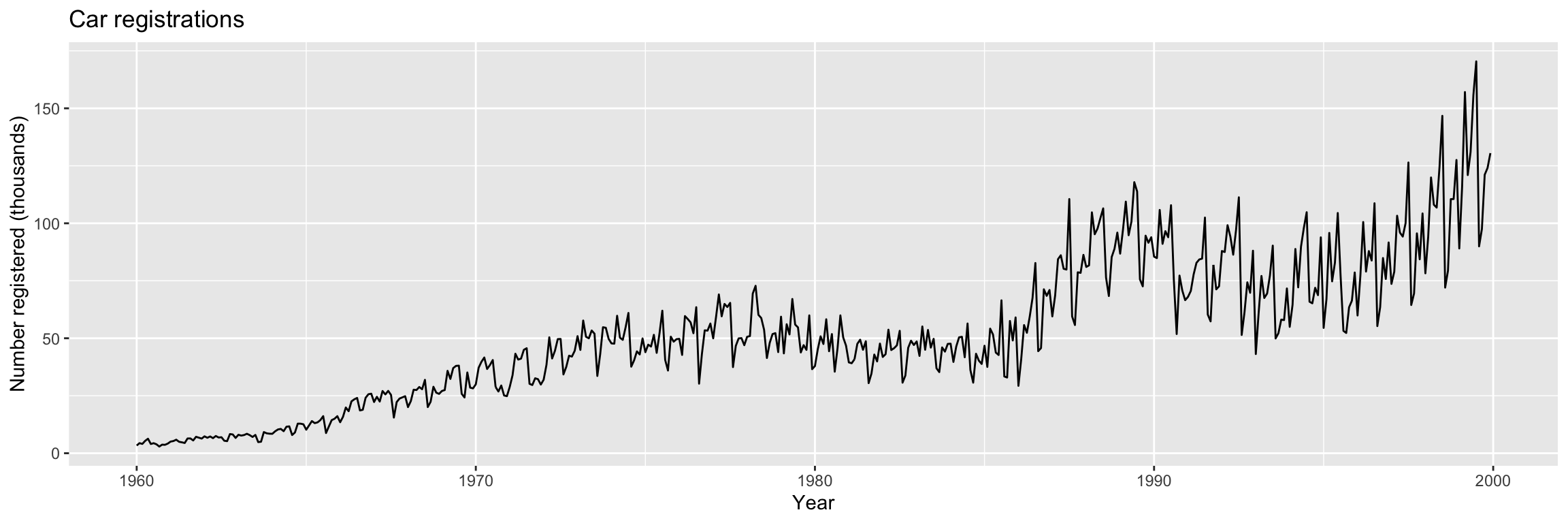y <- ts(fdata$CarReg, start = start_date, frequency = freq)Time plot: