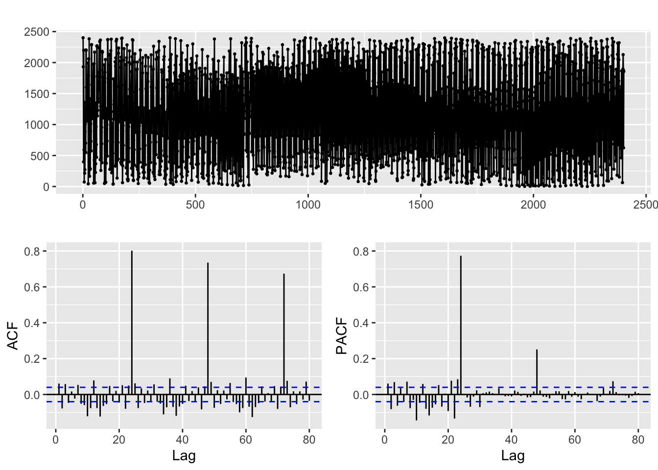 The time plot does not clearly show the frequency (in cases like this you should try zooming in, though!). But the ACF is more telling, it shows significant correlations at what seems to be lags = 24, 48, 96, … (so the sampling rate of this data seems to be … daily, weekly, … ?)
