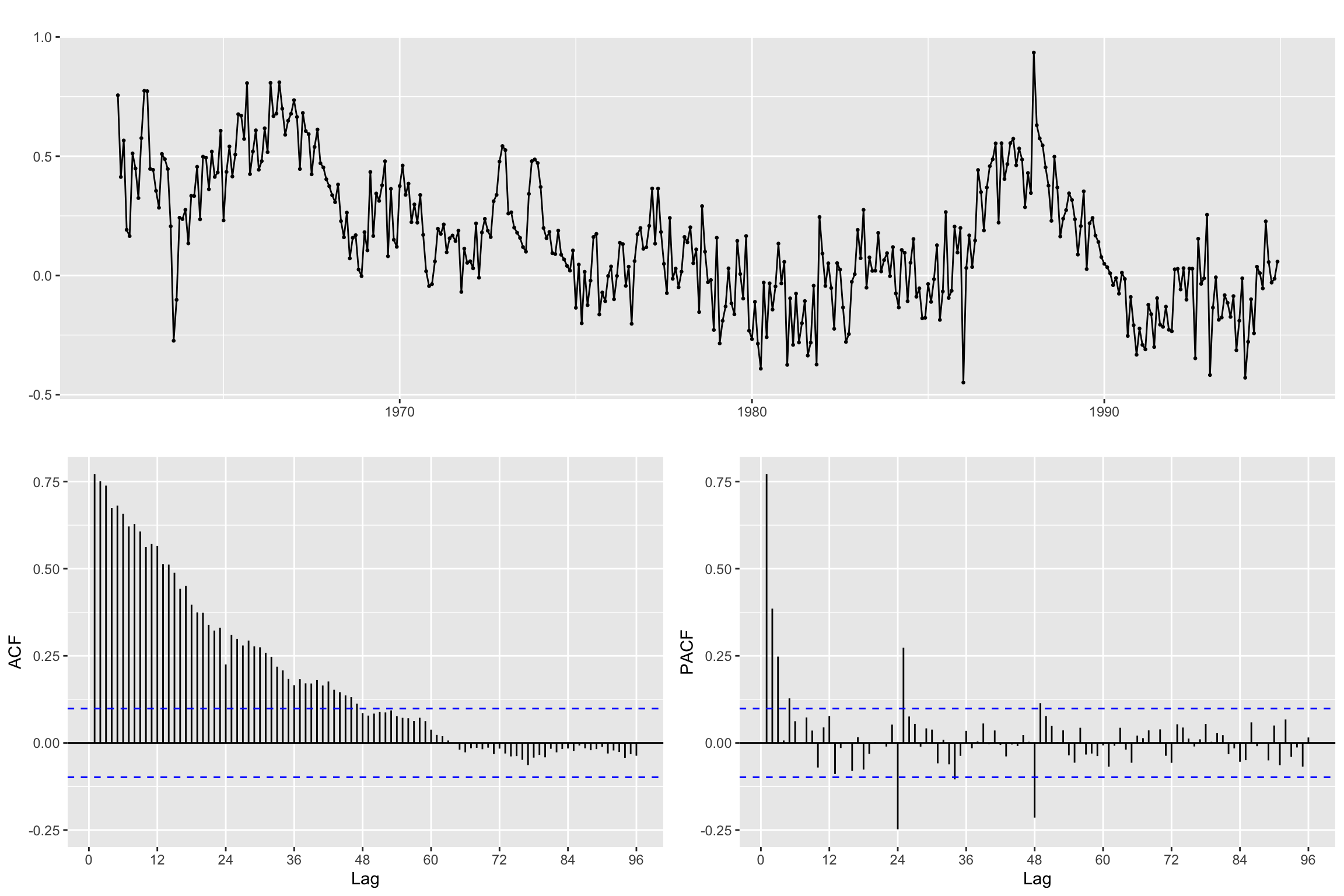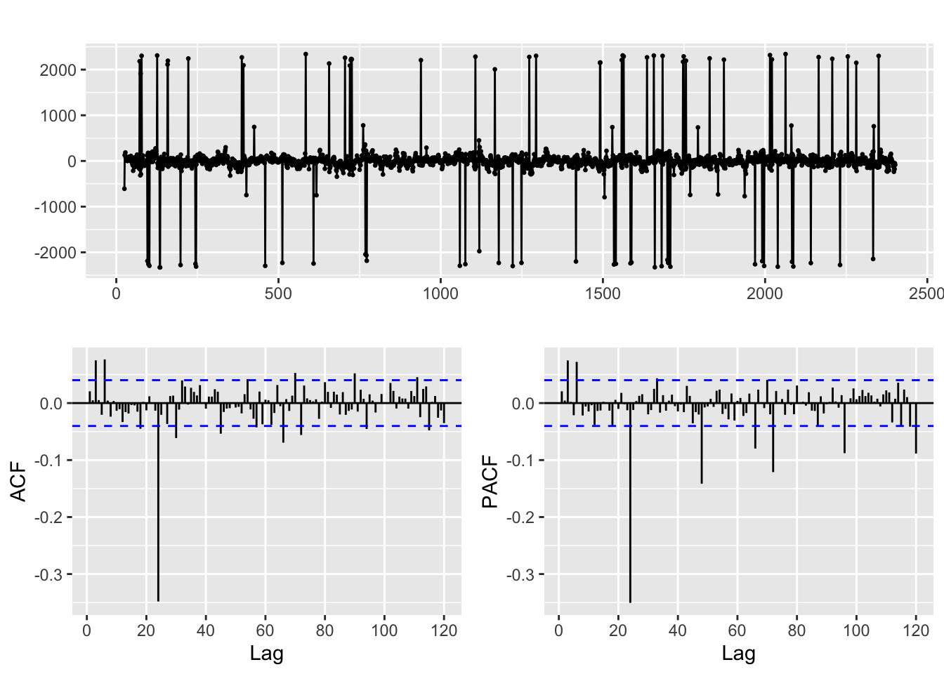 ggtsdisplay(diff(fdata2, lag = freq), lag.max = 5 * freq)